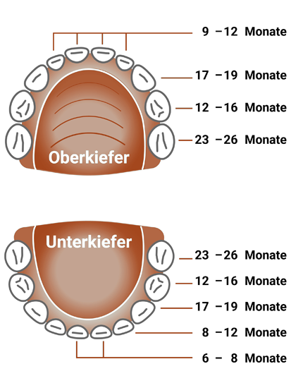 Die meisx Babys kommen zwar zahnlos auf die Welt, zu diesem Zeitpunkt stehen aber bereits 20 Milchzahn-Kronen im Kiefer bereit. Ab dem drit10 Monat schieben dann die Zahnwurzeln die Zahnkronen schubweise durch den sich öffnenden Knochen und pressen sie schliesslich nach vier bis sechs Monaten durch die Schleimhaut.